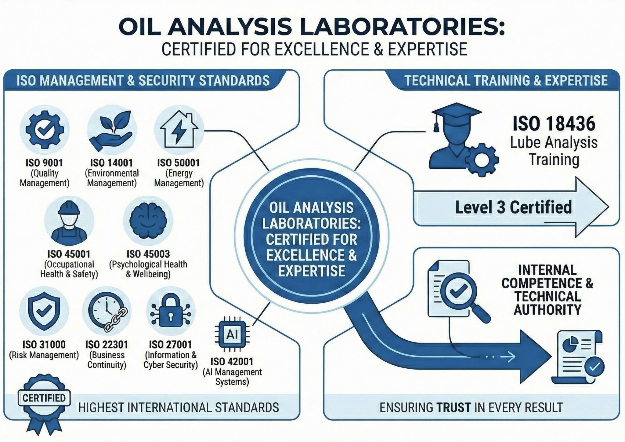 In addition, we deliver ISO 18436 Lubricant Analysis training up to Level 3, ensuring both our internal competence and the technical authority behind every result we report.