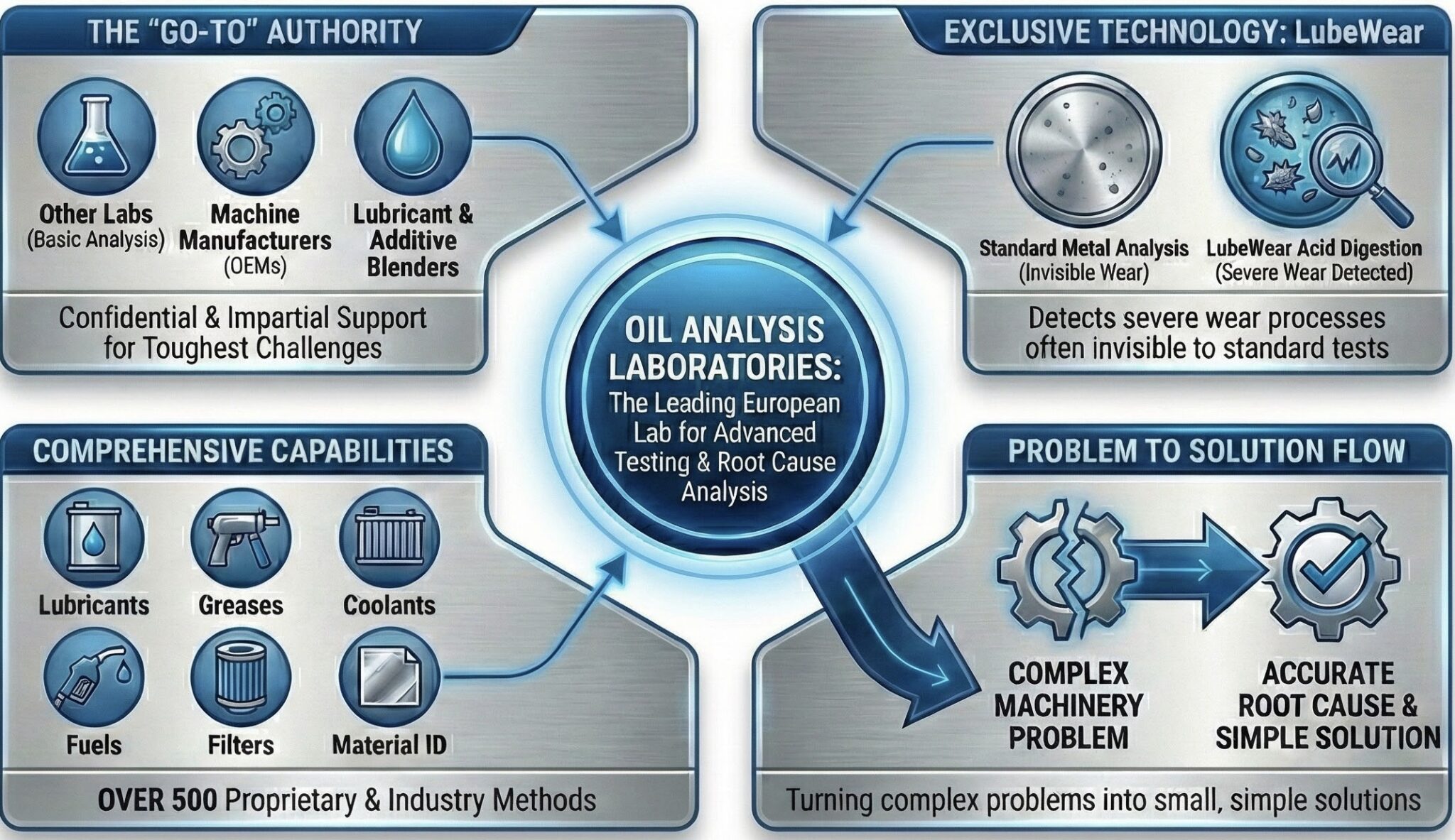 Many labs offer a basic oil analysis services. However, only Oil Analysis Laboratories is recognised as the lab for advanced testing that everyone turns to, even other labs, when a complex machinery problem arises basic analysis can’t solve. In fact we are the leading European laboratory for advanced testing of lubricants, greases, coolants, AdBlue/DEF, fuels, filters and material identification.