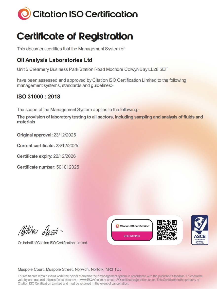 Oil Analysis laboratories recognises the importance of mitigating risk for our customers assets and hence we incorporate ISO risk management practices in all our processes and are externally audited on this criteria.